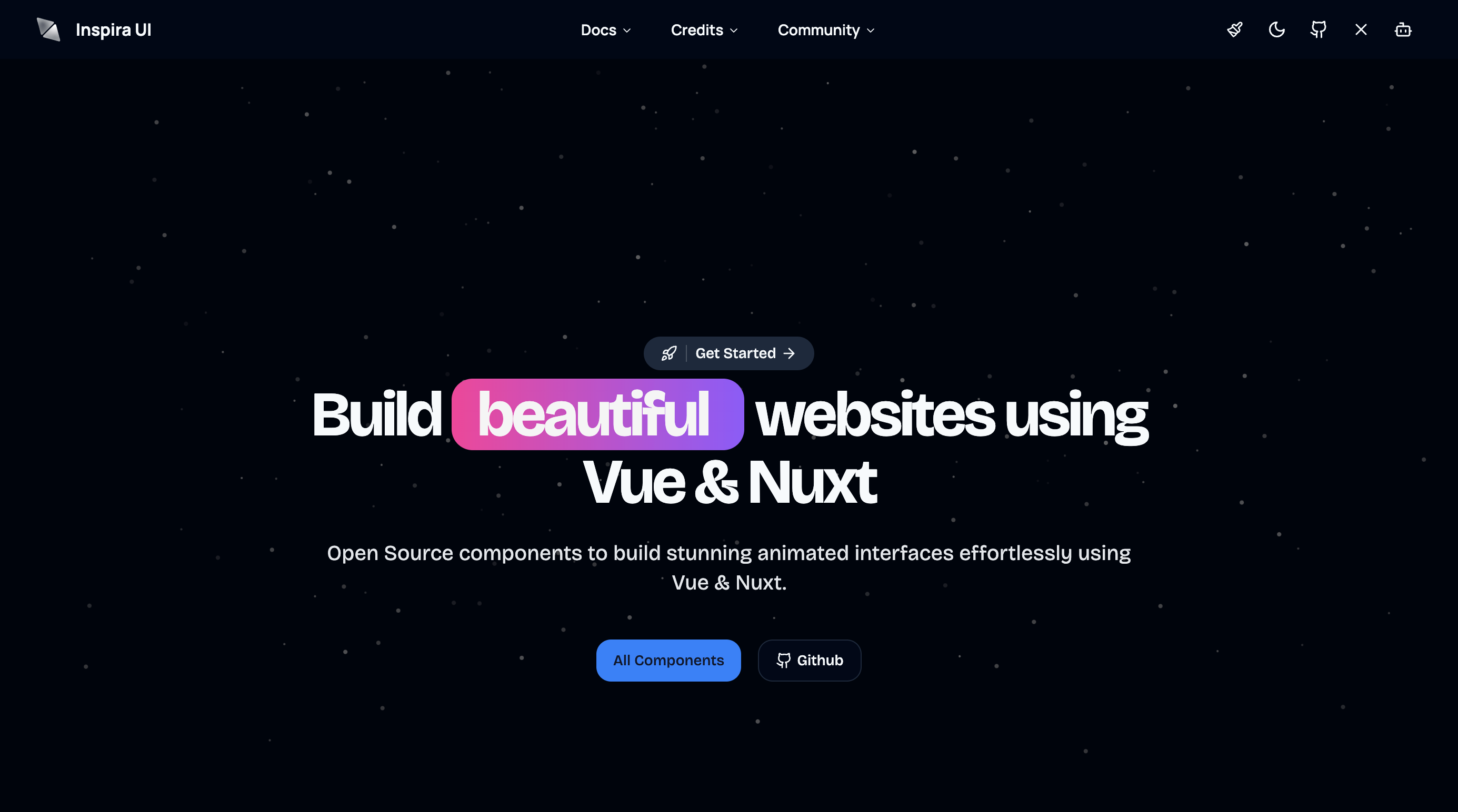 # Complete documentation of Inspira UI URL: https://inspira-ui.com/docs/index --- title: Home description: Built beautiful websites using Nuxt & Vue icon: "lucide:home" --- # Welcome to Inspira UI Build beautiful websites using Nuxt & Vue. --- Inspira UI is a collection of reusable, animated components powered by [TailwindCSS](https://tailwindcss.com/), [motion-v](https://motion.dev/docs/vue), [gsap](https://gsap.com/) & [threejs](https://threejs.org/) — crafted to help you ship faster and better. Whether you're starting a new project or refining a current one, this is the place to begin. ## Quick Links ::card-group ::card{ icon="lucide:rocket" title="Getting Started" description="Kick off your journey with installation, setup, and usage guides." to="/getting-started"} :: ::card{ icon="lucide:play" title="Installation" description="Explore different ways to install Inspira UI — via CLI, manual import, or copy-paste." to="/getting-started/installation"} :: ::card{ icon="lucide:box" title="Components" description="Browse the full list of components, each with clear documentation and beautiful previews." to="/components"} :: ::card{ icon="lucide:blocks" title="Blocks" description="Discover ready-made layout blocks you can mix and match to build complete sections and pages." to="/blocks"} :: :: ## Join the community We're building this together. Come say hi, share feedback, or contribute! - [**Discord**](https://discord.gg/Xbh5DwJRc9) – Chat with the community and get help - [**X (Formely Twitter)**](https://x.com/rahulv_dev) – Follow for updates and sneak peeks - [**Bluesky**](http://bsky.app/profile/inspira-ui.com) – For indie and alt-web conversations - [**GitHub**](https://github.com/unovue/inspira-ui) – Star the repo to support us! ★ ## Support Us Help us grow and keep Inspira UI thriving 💜 by [**becoming a sponsor**](https://github.com/sponsors/rahul-vashishtha). ## Repo Stats ![Repo Stats](https://repobeats.axiom.co/api/embed/da99e5e9c8ddaaff68b7f57b56ae21d5e0ea2ed2.svg "Repobeats analytics image") ## Thanks to all the contributors 🙏 [![Contributors](https://contrib.rocks/image?repo=unovue/inspira-ui)](https://github.com/unovue/inspira-ui/graphs/contributors) --- Made with ♥ by [Rahul Vashishtha](https://rahulv.dev) and the Vue community. URL: https://inspira-ui.com/docs/getting-started/Introduction --- title: Introduction description: Reusable components built with shadcn-vue, motion-v, and TailwindCSS icon: "lucide:info" --- Welcome to [**Inspira UI**](https://inspira-ui.com), a community-driven project for [Vue](https://vuejs.org)! This collection offers beautifully designed, reusable components, taking inspiration from the amazing work done on both [Aceternity UI](https://ui.aceternity.com) and [Magic UI](https://magicui.design). While we're not officially affiliated with these projects, we have received permission from Aceternity UI's creator to adapt those fantastic designs for the Vue ecosystem. Additionally, Inspira UI includes custom components developed by us and contributed by the community. ### About Inspira UI Inspira UI is **not** a traditional component library. Instead, it's a curated collection of elegant components you can easily integrate into your applications. Simply pick what you need, copy the code, and customize it to fit your project. The code is yours to use and modify as you like! ### Why Inspira UI? This project began to fill a gap in the Vue community for a similar set of components. Inspira UI brings the beauty and functionality of Aceternity UI, Magic UI, and custom contributions to Vue, making it easier for developers to build stunning applications. ### Key Features - Completely [free and open source](https://github.com/unovue/inspira-ui) - Highly [configurable](/components) to meet your design needs - A wide range of [components](/components) to choose from - Optimized for mobile use - Fully compatible with Nuxt ### Acknowledgments Special thanks to: - [Aceternity UI](https://ui.aceternity.com) for inspiring this Vue adaptation. - [Magic UI](https://magicui.design) for their design inspiration. - [shadcn-vue](https://www.shadcn-vue.com/) for the Vue port of shadcn-ui and contributing some components for docs. - [shadcn-docs-nuxt](https://github.com/ZTL-UwU/shadcn-docs-nuxt) for the beautifully crafted Nuxt documentation site. ### About Me Hi, I'm [Rahul Vashishtha](https://rahulv.dev). I started Inspira UI to bring a similar experience to the Vue ecosystem, inspired by Aceternity UI, Magic UI, and community contributions. I'm continuously working on it to make it better. Feel free to check out my work on [GitHub](https://github.com/rahul-vashishtha) and join me on this journey [here](https://github.com/unovue/inspira-ui)! Feel free to explore and enjoy building with Inspira UI! URL: https://inspira-ui.com/docs/getting-started/installation --- title: Installation description: How to install Inspira UI in your app. icon: "lucide:play" --- This guide will help you install and set up Inspira UI components in your Vue or Nuxt application. ::alert{type="warning" title="For Tailwind CSS v3 users"} If you are using Tailwind CSS v3, [Checkout Inspira UI v1 here](https://v1.inspira-ui.com). :: ::alert{type="alert"} **Note:** If you're using `shadcn-vue`, you can skip the installation steps and install only following libraries. ::code-group ```bash [npm] npm install @vueuse/core motion-v ``` ```bash [pnpm] pnpm install @vueuse/core motion-v ``` ```bash [bun] bun add @vueuse/core motion-v ``` ```bash [yarn] yarn add @vueuse/core motion-v ``` :: Follow this guide to setup `motion-v` on [Vue or Nuxt](https://motion.dev/docs/vue). :: ## Getting Started with Inspira UI ::steps ### Set up `tailwindcss` To begin, install `tailwindcss` using this [Vite install guide for Vue](https://tailwindcss.com/docs/installation) or using this [framework-specific guide for Nuxt](https://tailwindcss.com/docs/installation/framework-guides/nuxt). ### Add dependenci